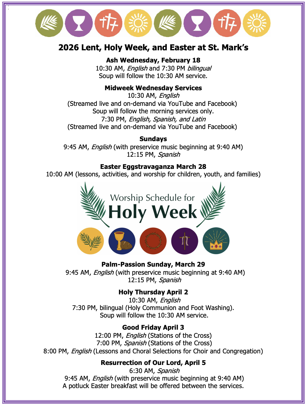 Click HERE for Lent and Easter Services info! Lent begins on Wednesday, February 18, with Ash Wednesday services at 10:30 AM in English and a Bilingual evening service at 7:30 PM.