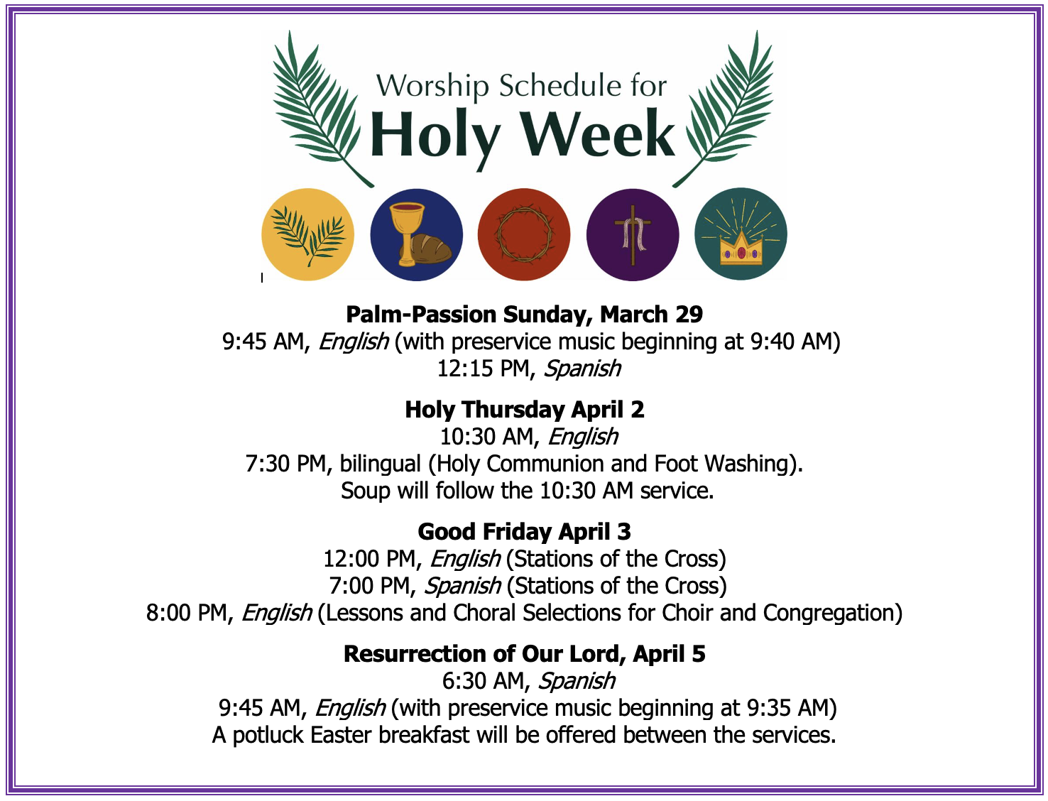 Join us 7:30 AM to 9:30 AM in the Fellowship Hall for a continental Easter breakfast courtesy of our Congregational Council!